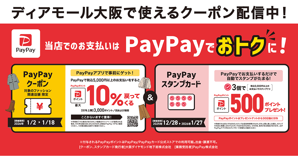 2026年1月2日(金)~1月18日(日)まで、ディアモール大阪のウィンターバーゲンと合わせてファッション関連店舗限定でお使いいただける、とってもお得なPayPayクーポンをご用意しました!