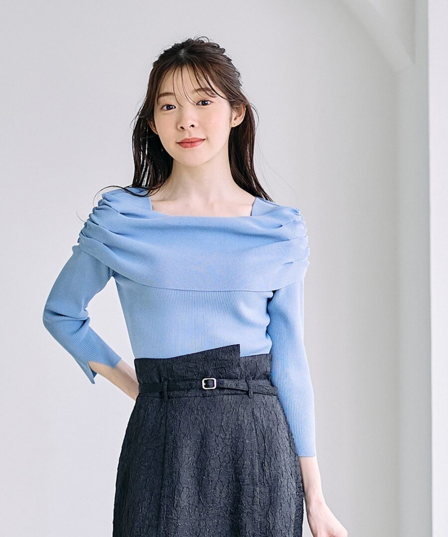 【サイドドロストドレープオフショル7分袖ニットプルオーバー】