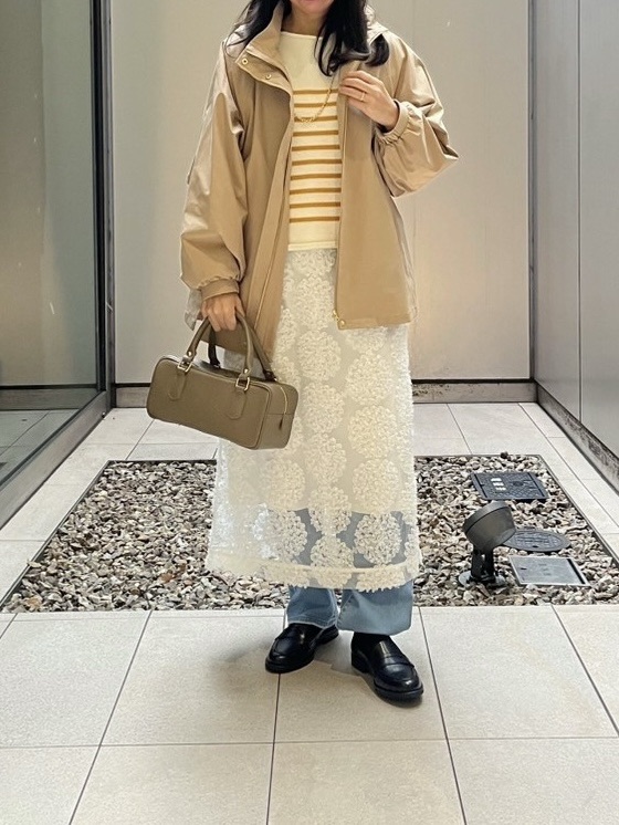 ブルゾンがカジュアルアイテムなので、ボトムにデニムだけではなく、レーススカートをレイヤードし、少しフェミニンさをプラスした大人カジュアルコーデもおすすめです◎