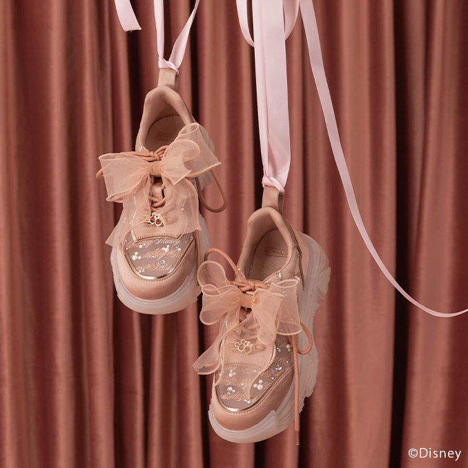 パールやビジューをちりばめた華やかなアッパーにリボンデザインが愛らしいマルチway仕様のシアースニーカー。程よいボリュームソールは安定感もあり、歩きやすく、テーマパークなどの行楽にもぴったり。