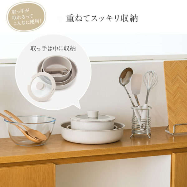 取っ手がとれて、使い方が広がるフライパンと鍋のセットです。