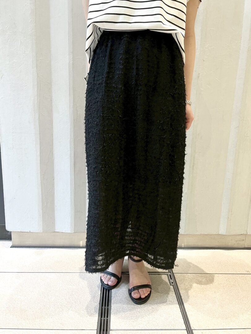 シーズンムードを高めるシアー素材のスカートで、シンプルなシルエットに派手過ぎないフリンジを全面にあしらったデザインが魅力的なスカートです。