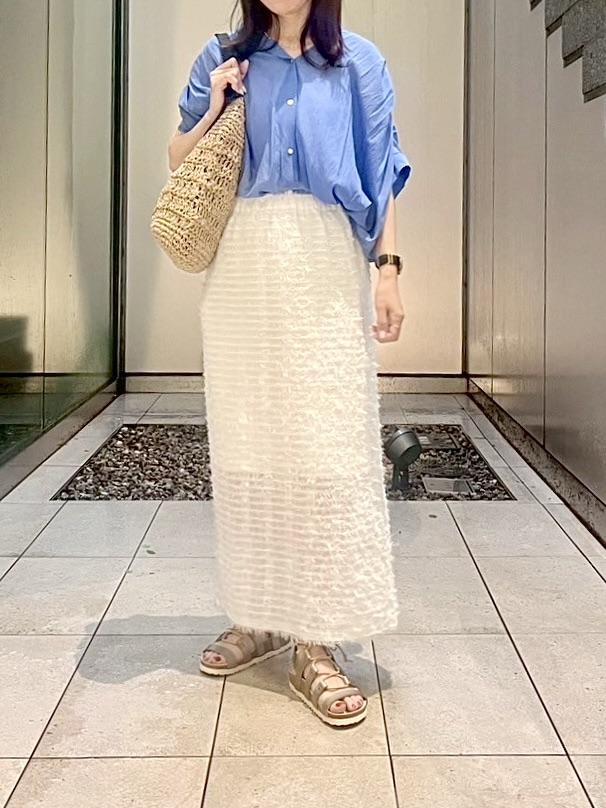 白のスカートでより爽やかさをプラスして頂くと、涼しげコーデでおすすめです。