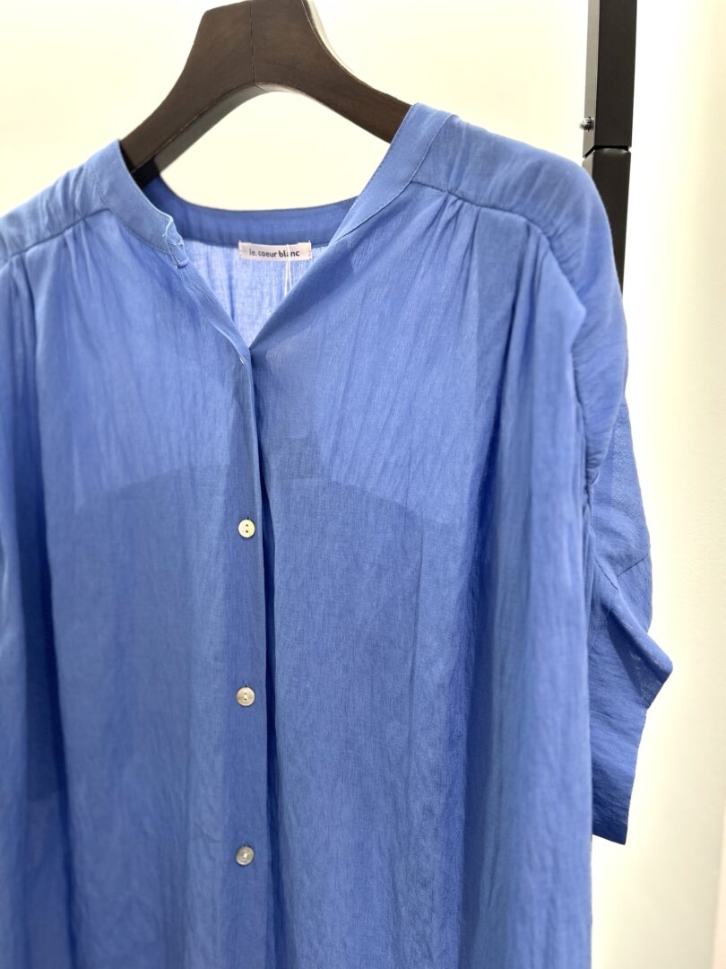 前後共にギャザーとフリルの見応えあるデザインを施しておりますが、バンドカラーのためスッキリとした印象で着られます◎