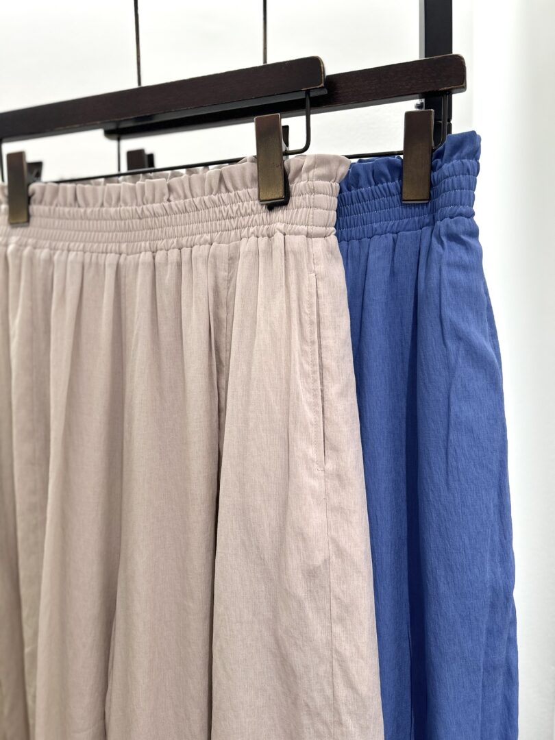 ウエストの部分のシャーリングとラメステッチがさり気ないアクセントになっています。
