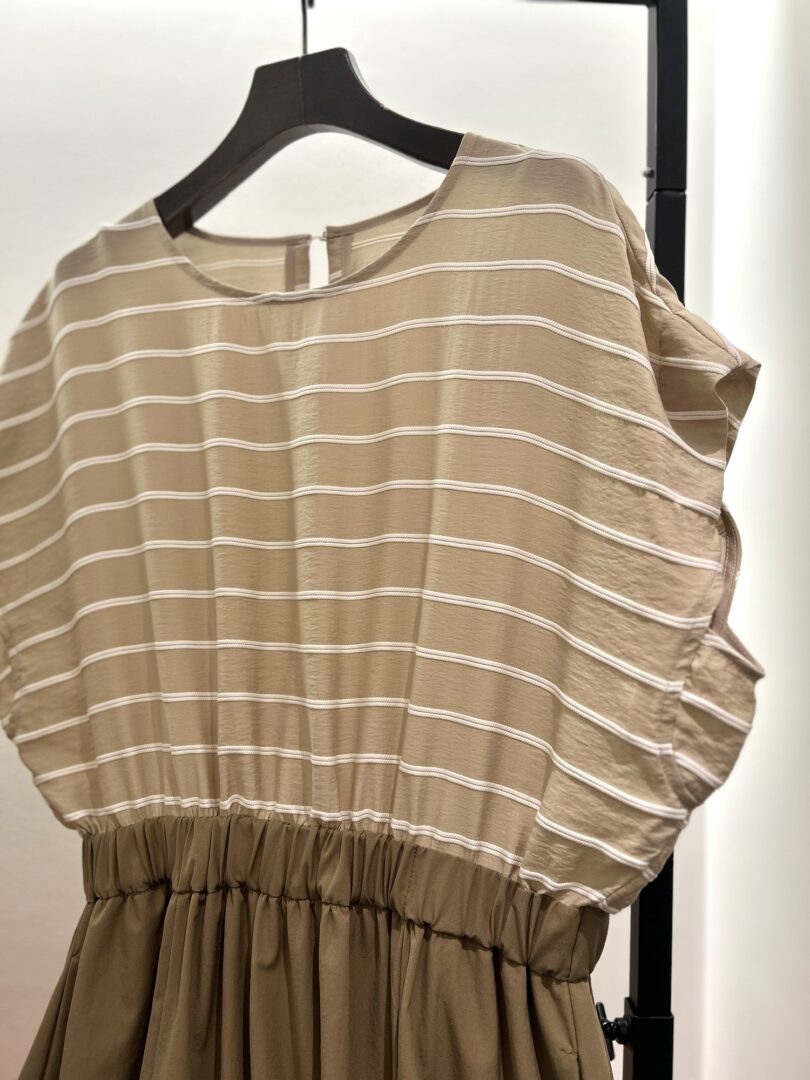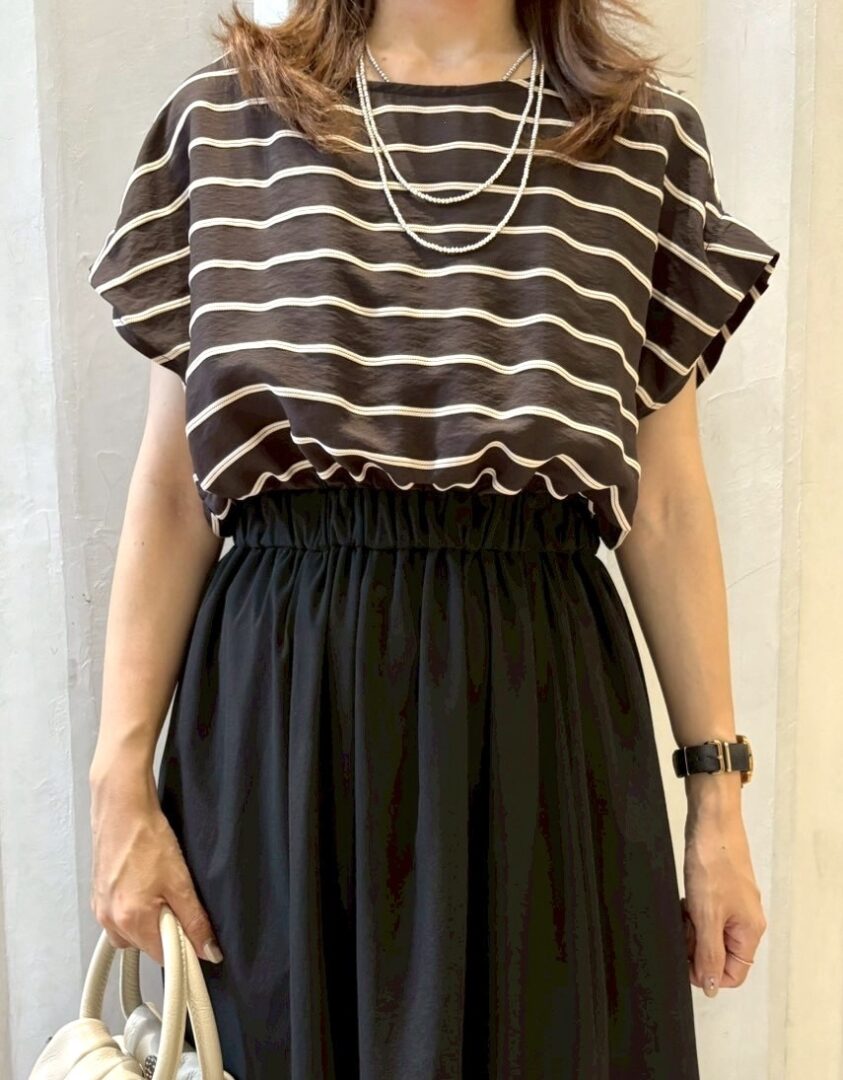 ルクールブランで毎年大人気のドビーボーダーギャザーブラウスの生地を使用したワンピースが新登場いたしました。