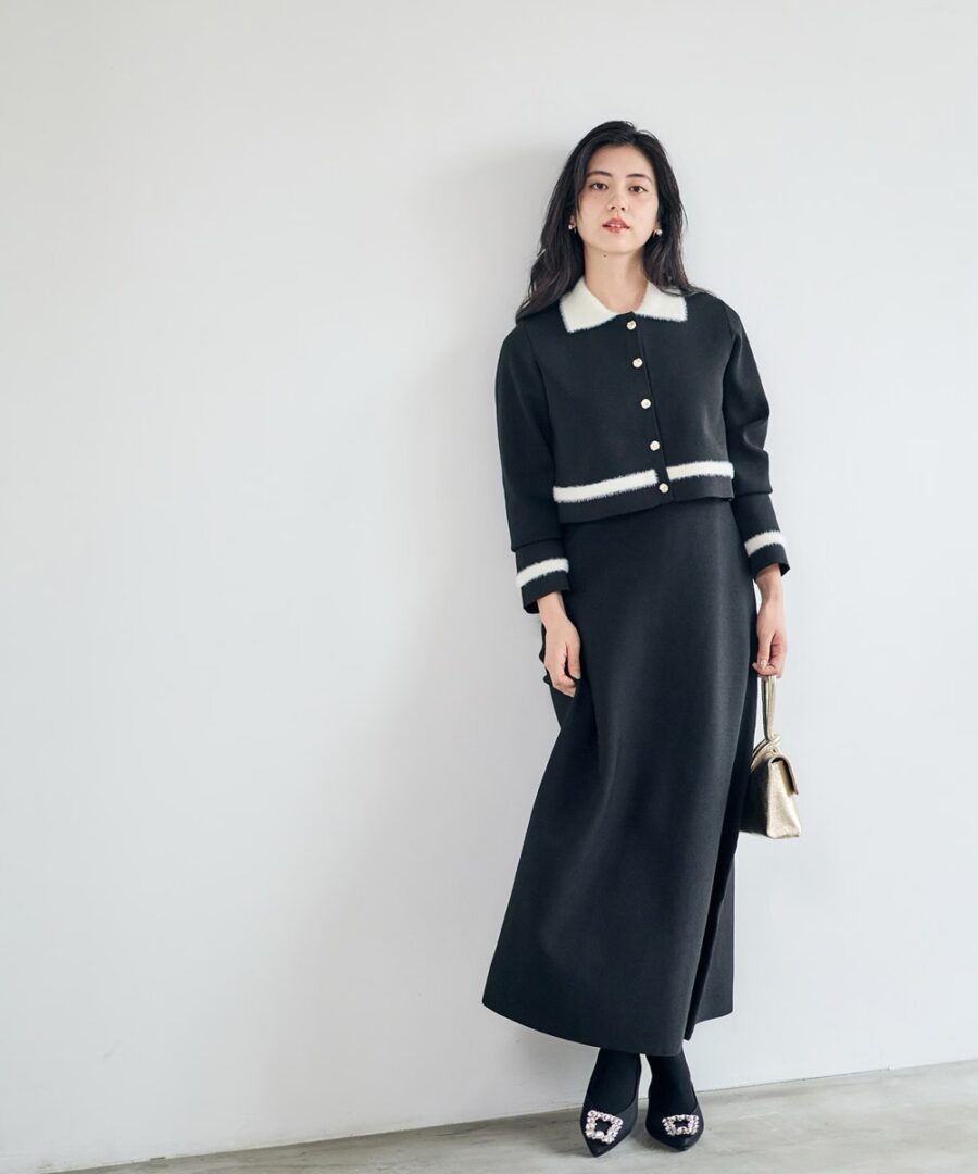 また、カーディガンにもフェザーニットのラインをあしらい、シンプルながらも奥行きのあるコーディネートを楽しめます!