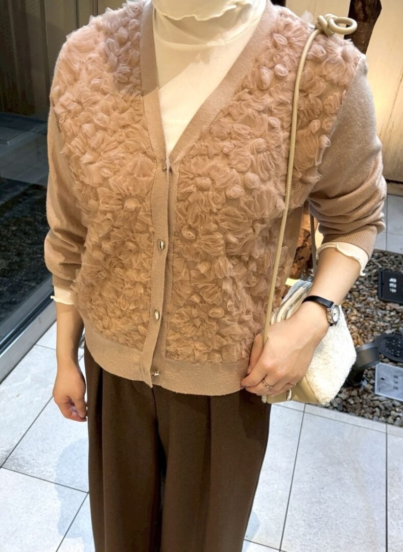 フラワーモチーフのチュールをふんだんに施し、立体的な素材感がポイントのカーディガン。