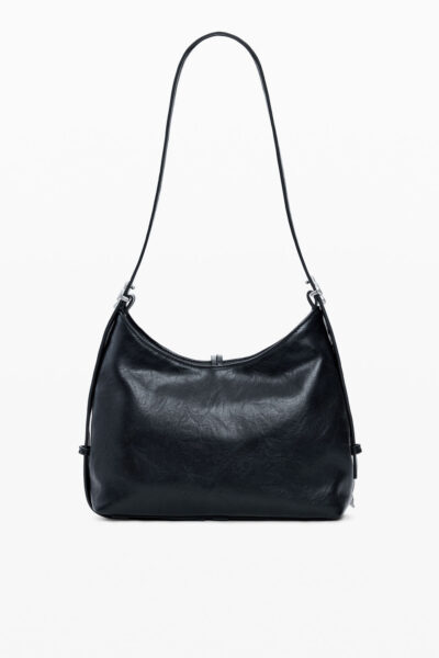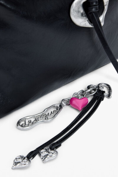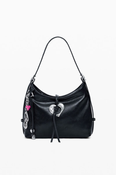 合成皮革風の中型バッグで、短い持ち手とハート型の金属ディテールが特徴的💛💖