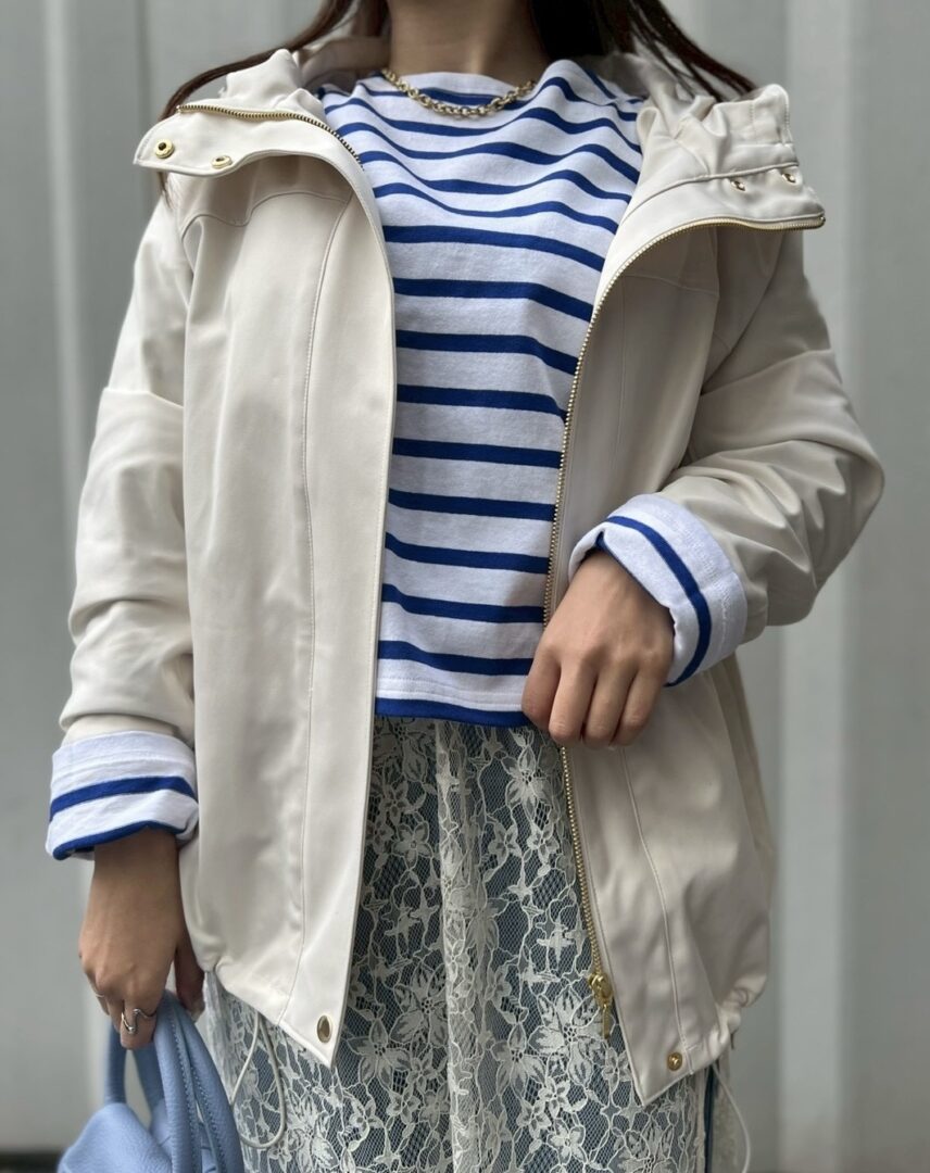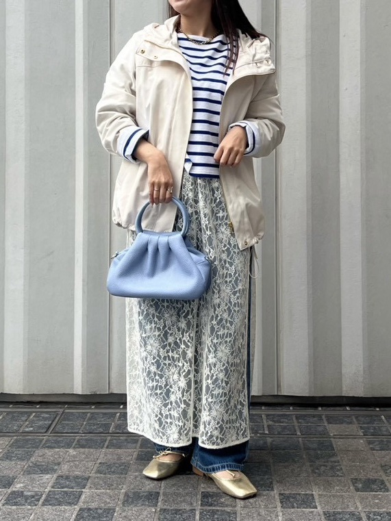 レースのスカートをレイヤードすることで、よりフェミニンな春コーデの完成です◎
