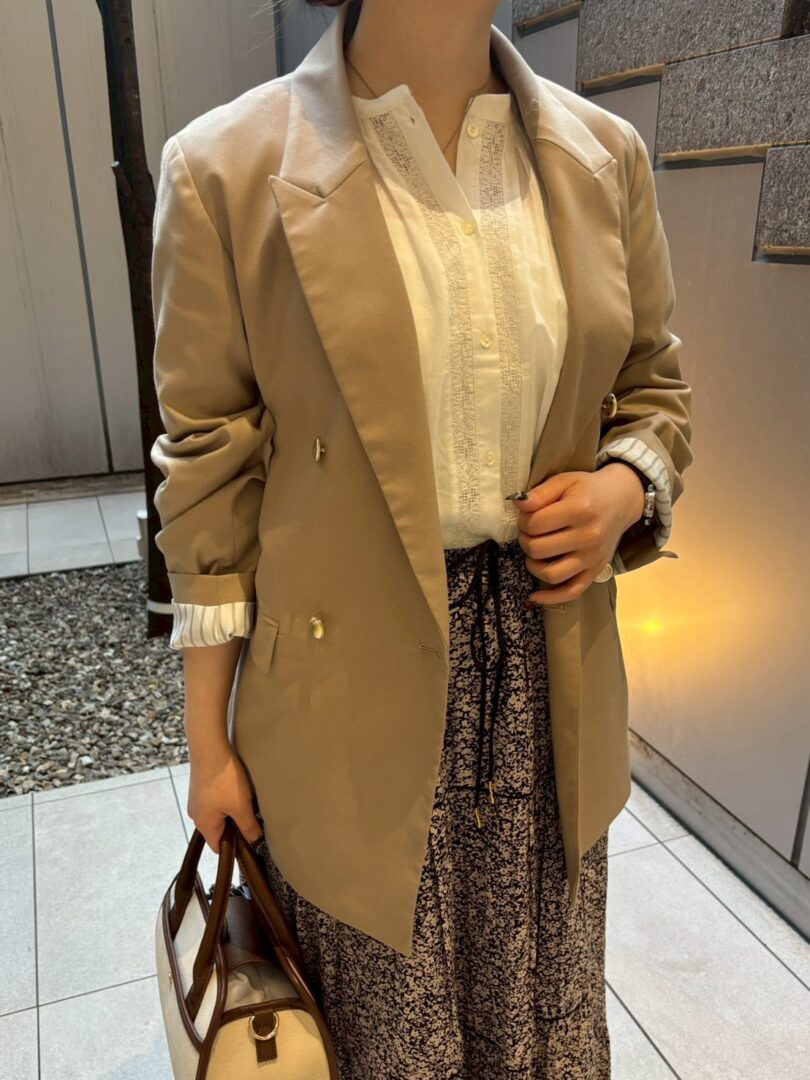 ゴールドボタンがポイントになり、メンズライクになりすぎず、程よく華やかな印象です。