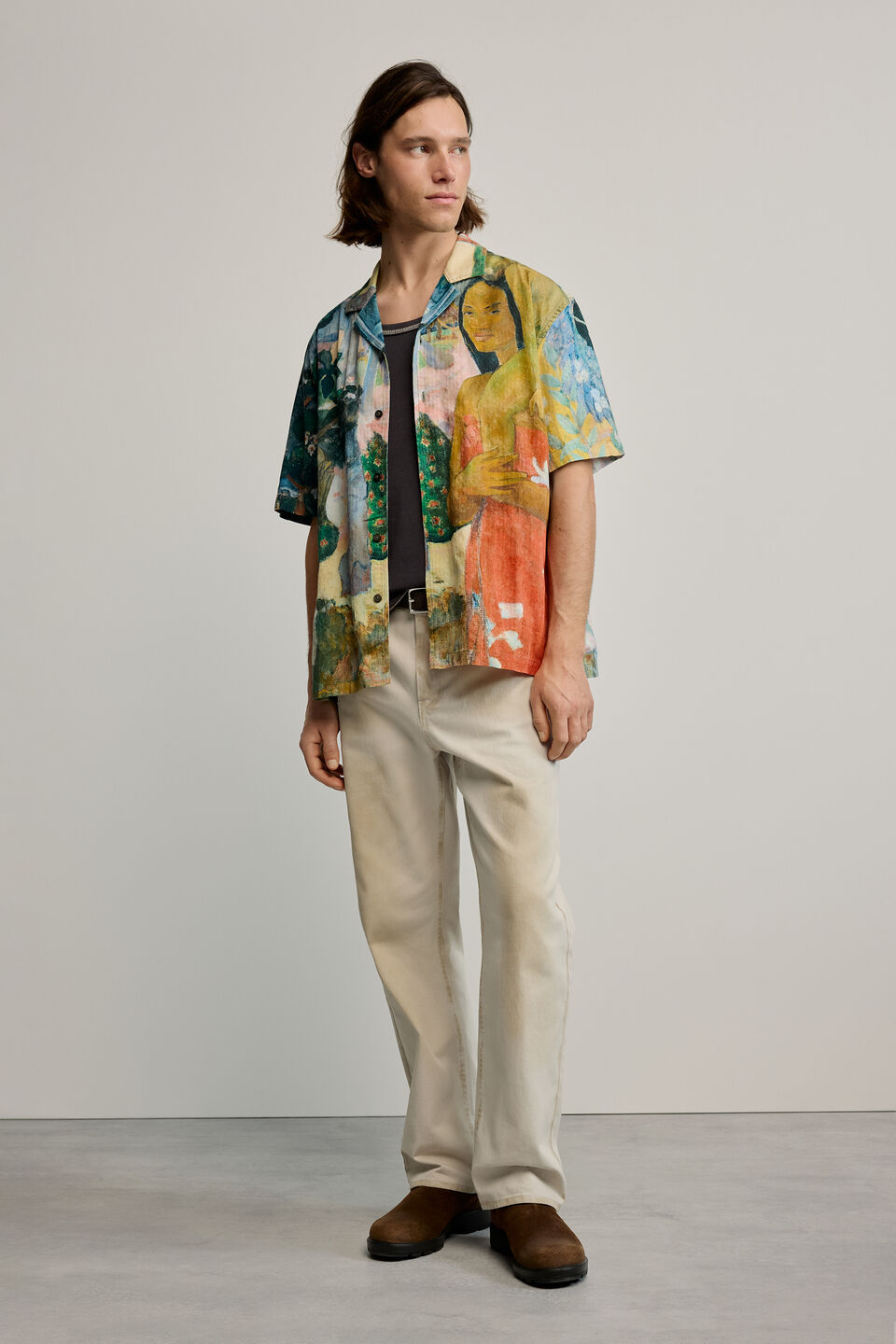 抽象的なプリントが施された、100%コットン生地の半袖シャツです🐔